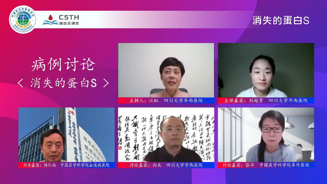 本期《病例討論:“消失”的蛋白S》邀請(qǐng)到了來(lái)自四川大學(xué)華西醫(yī)院的劉超男老師作為主講嘉賓,由四川大學(xué)華西醫(yī)院江虹教授擔(dān)任本期主持人,特邀中國(guó)醫(yī)學(xué)科學(xué)院血液病醫(yī)院楊仁池教授、四川大學(xué)華西醫(yī)院向兵教授、中國(guó)醫(yī)學(xué)科學(xué)院阜外醫(yī)院張洋老師三位討論嘉賓。