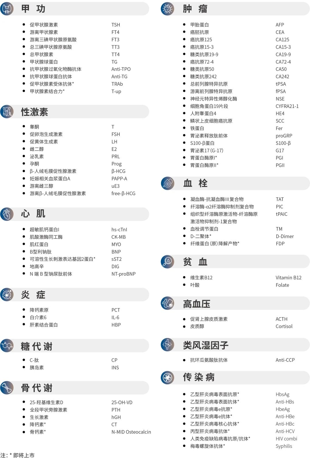 · 覆蓋全面:腫標(biāo)、甲功、心肌、炎癥、性激素、糖代謝等常規(guī)項(xiàng)目